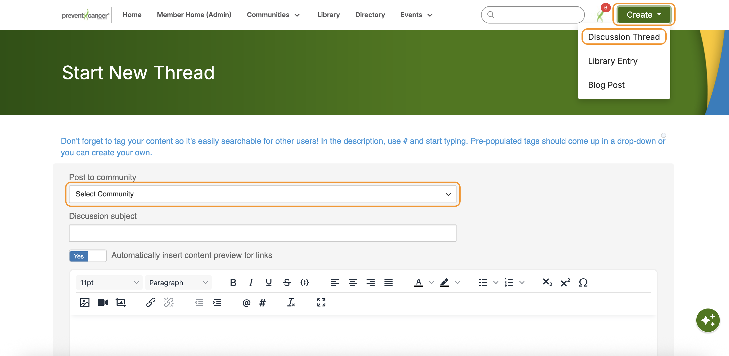 A: Click Create in the menu bar, select Discussion Thread, choose the community you want to post in, then add your title and message. When you’re ready, click Post to share it with the group.