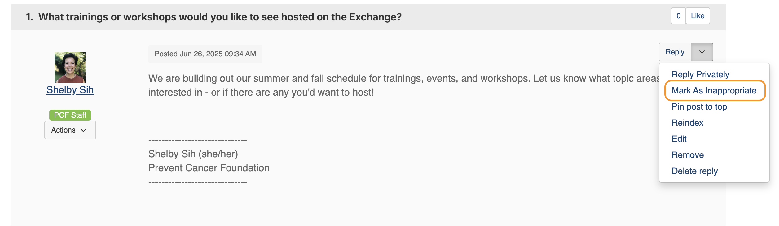 A: Each post has a “Mark as Inappropriate” option in the dropdown menu. When flagged, the post will be reviewed by the site moderators. If you believe something violates community standards, please mark it as such and email pcfexchange@preventcancer.org with details.
